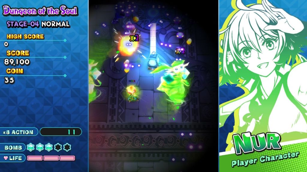 Das Spieltempo ist für einen Bullet Hell Shooter gemächlich. Verstärkt wird dieser Eindruck durch die „laufenden“ Helden. Richtig gelesen. Während man bei den meisten Shoot em ups, unabhängig vom gesteuerten Helden (sei es ein Raumschiff, Panzer oder Mensch), fliegt oder fährt, ist man hier zu Fuß unterwegs. Dieser Umstand führt dazu, dass man an der einen oder anderen Stelle um Hindernisse herumlaufen muss. Immerhin stirbt man nicht bei einer Berührung des selbigen. Für Überraschungen sorgen hier und da Ventilatoren, welche eure Figur in eine bestimmte Richtung drängen oder Eisflächen, auf welchen ihr euch logischerweise „schwamminger“ steuern lasst.