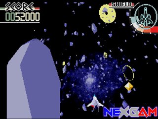 Seid ihr mit eurem Raumjäger schließlich vom Mutterschiff gestartet kommen auch schon recht bald die ersten Feindformationen in Sichtweite. (A) und (C)-Button werden zum Zwecke des Selbstschutzes malträtiert und schießen eine Salve mit der Standardbewaffnung Richtung Gegner, während der (B)-Button einzig und allein für die Spezialwaffe benötigt wird. Selbige gibt es allerdings frühestens erst ab Level 2, wobei ihr nach jedem Level im Hangar eure Bewaffnung neu auswählen dürft und neuerworbene Teile an eurem Baby verbaut.