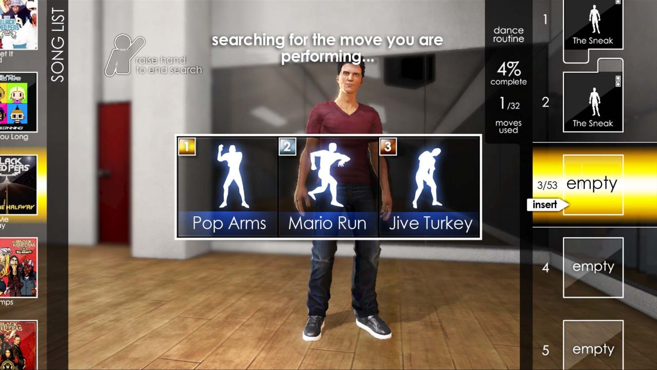 Um das Spiel zu starten, muss man keine Geste ausführen. Nein, man muss einen Tanzschritt nachahmen, wenn man ins Hauptmenü will. Irgendwie cool gemacht - eine Brise frischen Winds im Genre! Auch das Menü an sich gestaltet sich sehr hübsch, mit ablaufenden Musik Clips und originalen Songs. Macht Laune auf mehr!