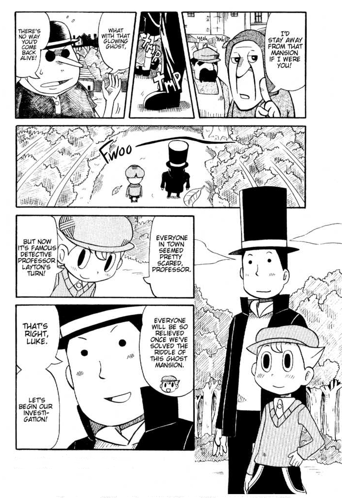 Anstatt mit einer langen und zusammenhängenden Geschichte voller Rätsel zu glänzen, möchte der Manga mit vielen teilweise sehr kurzen Geschichten überzeugen. So wird die Vorfreude auf eine Story wie beispielsweise im DS-Ableger zu schon auf den ersten Seiten gebremst. Schade! Aber gut, sei's drum. Das dachte ich anfangs auch. Kleine Geschichten können auch spannend sein, so ist das ja nicht. Vor allem war ich gespannt darauf, ob und wie Rätsel im Manga vorkommen.