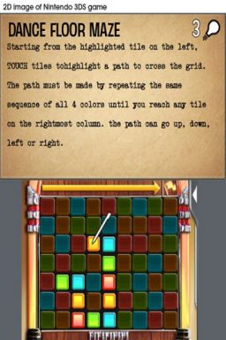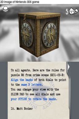 Die Rätsel selbst sind größtenteils gelungen und animieren zum Weiterspielen. Der Schwierigkeitsgrad schwankt zwischen sehr leicht bis unglaublich schwer. An so mancher Aufgabe habe ich mir das Hirn zermartert. Mit dem Stift lassen sich Bretter verschieben, Zahnräder drehen, Farben kombinieren und das gesamte Spiel steuern. Es gibt Rätsel, die mithilfe des Analogpads gelöst werden, indem ihr eure Ansicht verändert. Von der Darstellung der Aufgaben war ich enttäuscht. Nur wenige kommen in 3D daher. Der Großteil wird auf dem unteren Bildschirm geknackt, was Sinn ergibt, wenn man schon mit dem Stift spielt. Mehr 3D-Rätselkost wäre trotzdem fein gewesen. Aber zumindest sieht der Tiefeneffekt in den Zwischensequenzen ganz nett aus. Diese kommen sogar in einer guten deutschen Sprachausgabe daher und unterstreichen die Film Noir Atmosphäre positiv.
