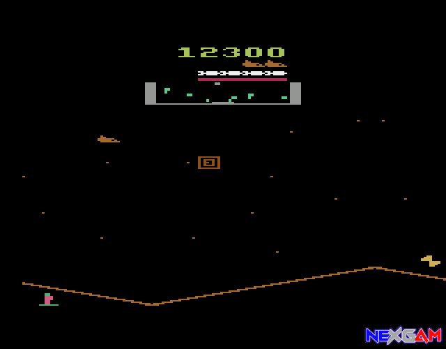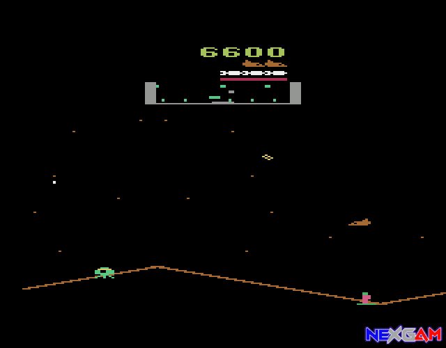 Interessant an der Geschichte ist ja das Stargate, auch als Defender 2 erschienen ist, vorzugsweise in Amerika. Nach Einlegen des Moduls und starten der Konsole bietet sich dem Spieler aber ein gewohntes Bild: Mit einem Druck auf den Feuerknopf während des Startbildschirms und gelangt sofort ins Spiel, das dem Original Defender schon weitaus ähnlicher sieht als Teil 1. Zwar ist die Umgebung nur in einem tristen braun gehalten, jedoch hat man es weder mit wildem Flackern, noch mit allzu grober Grafik zu tun.