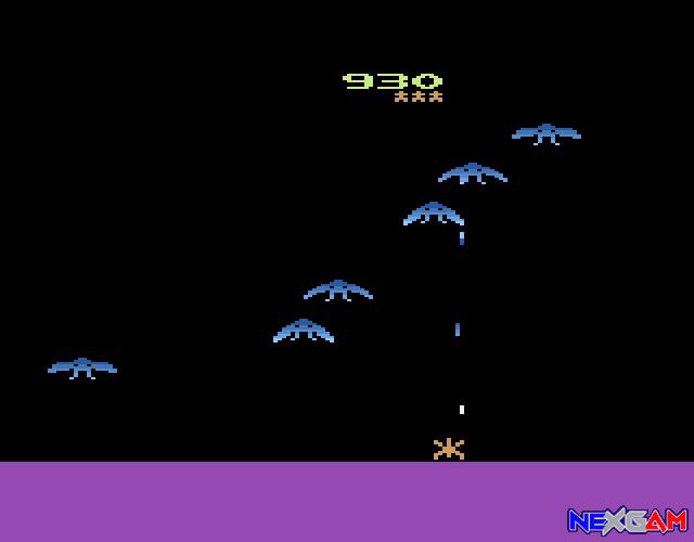 Die gefiederte Brut rückt euch dabei stets in vier Wellen auf die Pelle. Während die ersten beiden Gegnerformationen noch stark an den Klassiker Space Invaders erinnern, bekommt ihr es mit der dritten und vierten Formation schon mit wirklichem Federvieh zu tun. Selbige tänzeln dabei wie gehabt über euch am Screen umher und feuern wahllos Schüsse auf euch ab, die ihr tunlichst meiden solltet. Eurerseits könnt ihr mittels Laserkanone das Feuer erwiedern, müsst die fliegenden Invasoren aber im Zentrum treffen, da ihr ihnen sonst nur kurzzeitig einen Flügel abtrennt - und die wachsen in sekundenschnelle wieder nach!