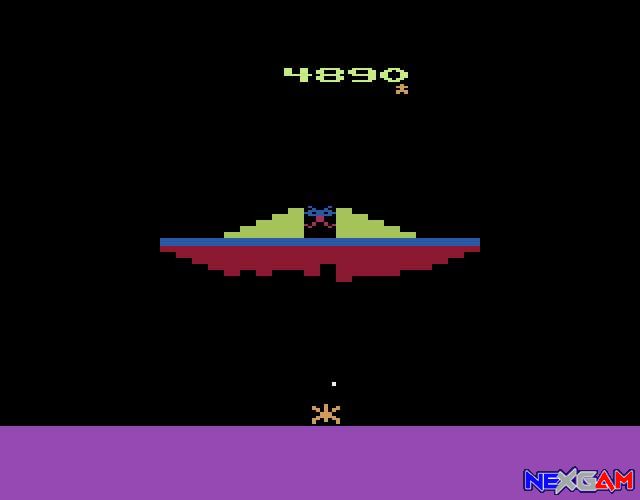 Habt ihr euch schließlich durch die Feindmassen geschlagen, wartet ein großer Obermotz in seinem Ufo auf euch. Auch hier gilt es mit der Ausweichen & Draufgeben Taktik den Feind so lange mürbe zu machen, bis er das Zeitliche segnet. Da die fliegende Untertasse allerdings nicht nur gut gepanzert, sondern auch noch gut bewaffnet ist, lohnt sich der Einsatz des Schutzschirms. Einfach den Joystick zurückgezogen, schon erscheint für wenige Sekunden ein schützender Schirm. Zwar könnt ihr euch in der Zwischenzeit nicht bewegen, wohl aber geschützt auf den Gegner feuern.