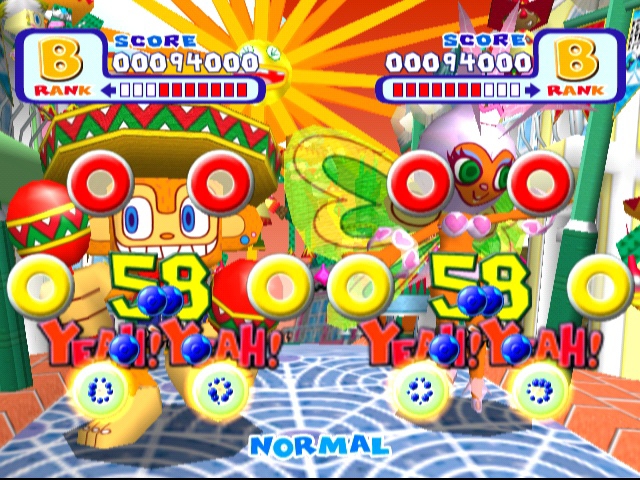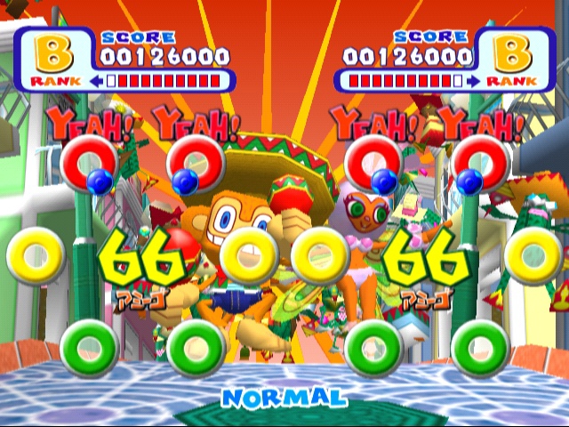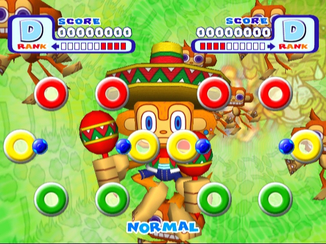 Nachdem ihr die Matte samt Sensorleiste und Rasseln an Eure Dreamcast angeschlossen und die Samba de Amigo GD ins DC-Laufwerk gelegt habt, braucht ihr nur noch einzuschalten und die Party kann losgehen. Als erstes begrüßt euch der 50/60Hz Auswahlbildschirm (der bei DC schon fast selbstverständlich ist). Habt Ihr Eure Wahl getroffen, gelangt ihr ins Startmenü, wo Ihr zwischen den Modi „Arcade“, „Original“, „Challenge“, „Party“, „Training“, „Internet“ und den Optionen wählen könnt. Arcade- und Original-Mode sind eigentlich die gleichen Modi, nur dass man im Original-Mode auch Lieder wählen kann, die man sich erspielt oder aus dem Internet geladen hat. Im Challenge-Mode arbeitet man sich vom Maracas-Beginner bis zum Maracas-King hoch. Bis man aber Maracas-König ist, bedarf es einiges an Übung, denn die zu lösenden Aufgaben werden immer schwieriger!