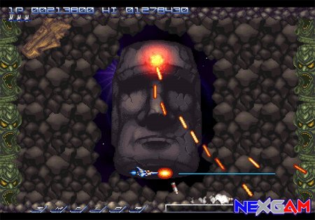 Das spiegelt sich am den grafischen Look wieder, der bewusst Retro gehalten wurde. Technisch ist Gradius Rebirth auf dem Stand von Gradius III, wobei dessen Slowdowns auf dem Super Nintendo auf ein Minimum reduziert wurden. Nur äußerst selten geht die Grafikengine in die Knie und auch nur, wenn der Bildschirm voller Gegner und Projektile ist. Als Fan der originale hat mir der Style sehr gut gefallen. Anders als der Soundtrack. Dieser ist auch auf SNES-Niveau, wobei die Musikauswahl keine wirklichen Ohrwürmer beinhaltet. Wofür die Ballerserie eigentlich bekannt ist. Soundeffekte und Sprachausgabe wurden 1:1 für die Wii umgesetzt. Ein feine Funktion versteckt sich hinter ’’Replay’’. Hier könnt ihr im Score-Attack-Modus euren Speedrun auf Konsole speichern und dann Mitmenschen präsentieren.