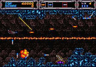 Ablauf: Wenig überraschend gibt sich der Plot weitestgehend überraschungsfrei; einmal mehr gilt es einem außerirdischen Imperium zu zeigen, wo der sprichwörtliche Hammer hängt. Zu Anfang lässt sich der Startlevel festlegen (Dschungel, Eiswelt, Lavawelt, Wasserlevel, Untergrund), danach spielt ihr die Level in einer festgelegten Reihenfolge, bis ihr in zwei weiteren Levels ein gigantisches Raumschiff zerstört und in die Zentrale des bösen Großmacht fliegt. Spielerisch gibt sich Thunderforce III flotter als R-Type oder Gradius, die Spielgeschwindigkeit und die Gegner sind höher. Auf der anderen Seite gibt sich Thunderforce III nachgiebiger als die beiden Kollegen, verliert ihr ein Leben, müsst ihr lediglich die gerade equippte Waffe aufgeben und könnt an der gleichen Stelle wiederbeginnen. Wo wir bei Waffen sind: Ihr könnt Euer Arsenal deutlich ausbauen; neben dem normalen Schuss und dem Rückwärtsschuss gibt es noch Laser, über den Boden fliegende Missles, Feuer und die allseits beliebte zielsuchende Hunter-Waffe. Desweiten könnt Ihr eure Friedensbringer mit dem Claw-Upgrade aufrüsten; nun rotieren zwei Waffen um Euer Raumschiff und ihr habt doppelte Feuerkraft. Selten gibt es auch mal einen Schild aufzusammeln.