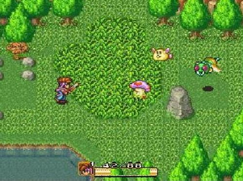 Vom Gameplay und Spielsystem präsentiert sich Secret of Mana als gesunder Mix zwischen Rollenspiel und klassischem Action-Adventure. Ihr steuert euer Alter-Ego in Echtzeit durch die blühenden Bitmap-Landschaften, weicht feindlichen Attacken aus und schlagt im richtigen Moment mit dem Schwert zu. Hierbei könnt ihr wählen, ob ihr lieber schnelle Combo-Ketten auf eure Wiedersacher niederprasseln lasst oder ihnen mit einem aufgeladenen Schlag zu Leibe rückt.