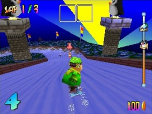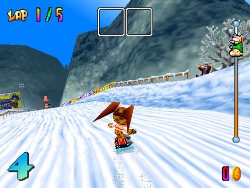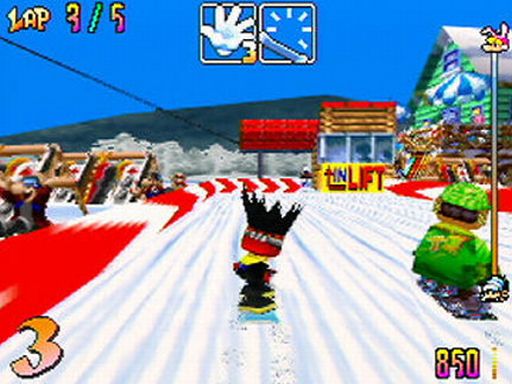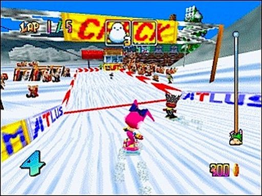 Anders, als Nintendos Erfolgsformel zu kopieren und mit Snowboard Kids einen einfachen Klon auf die Menschheit loszulassen, erweiterte Atlus das Konzept um einige frische Ideen, die für Abwechslung sorgen. So fährt man die Kurse nicht im Kreis. Ein Aufzug muss am Fuß der Piste bestiegen werden. Wehe dem, der in der Eile des Gefechts gegen die Bande rast und wertvolle Sekunden verliert. Auch stehen zwei Item Slots zur Verfügung. Auf der Strecke sind Boxen verteilt, die euch beim Drüberfahren mit Bomben, Steinen, Geistern und Schneemanngeschossen versorgen. Einige Items sind dazu da, um eure Gegner aufs Korn zu nehmen, mit anderen schützt ihr euch vor feindlichem Beschuss. Standardkost eben, wären da nicht die besagten Slots, die es euch erlauben, jeweils zwei Gegenstände gleichzeitig mitzunehmen. So könnt ihr taktisch vorgehen und euren Gegner gezielt Saures geben. Das Sahnehäubchen wäre, wenn man die Items upgraden könnte, ganz wie in Diddy Kong Racing.