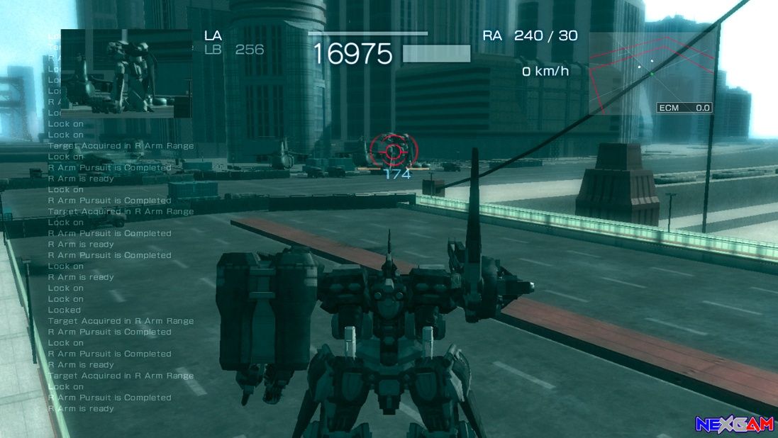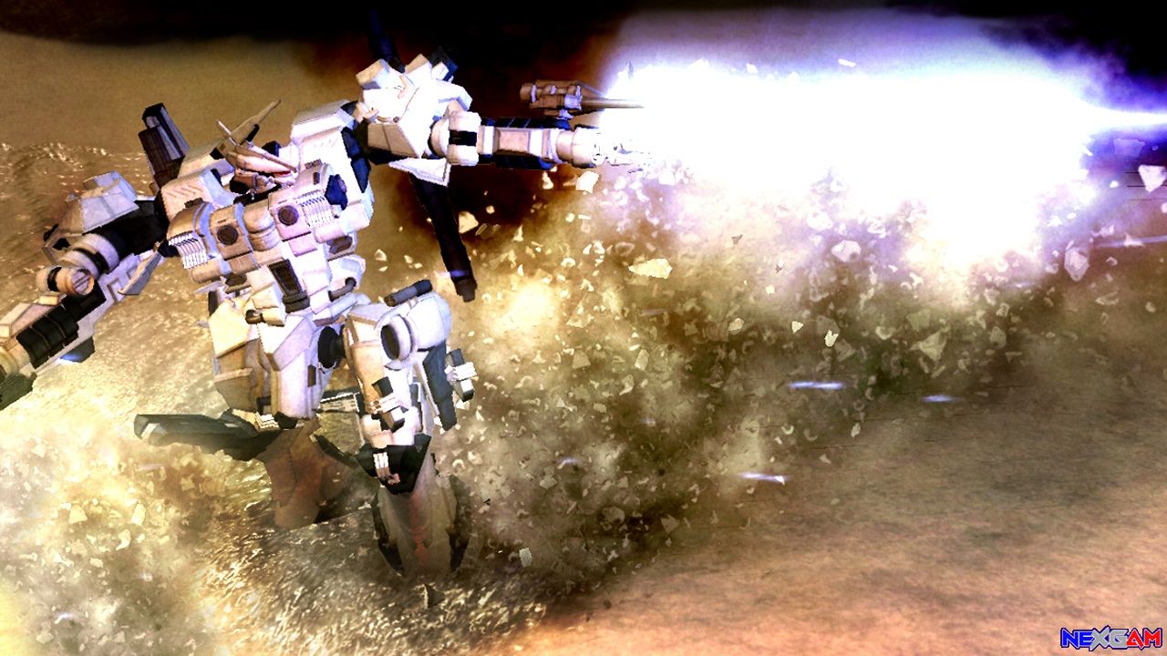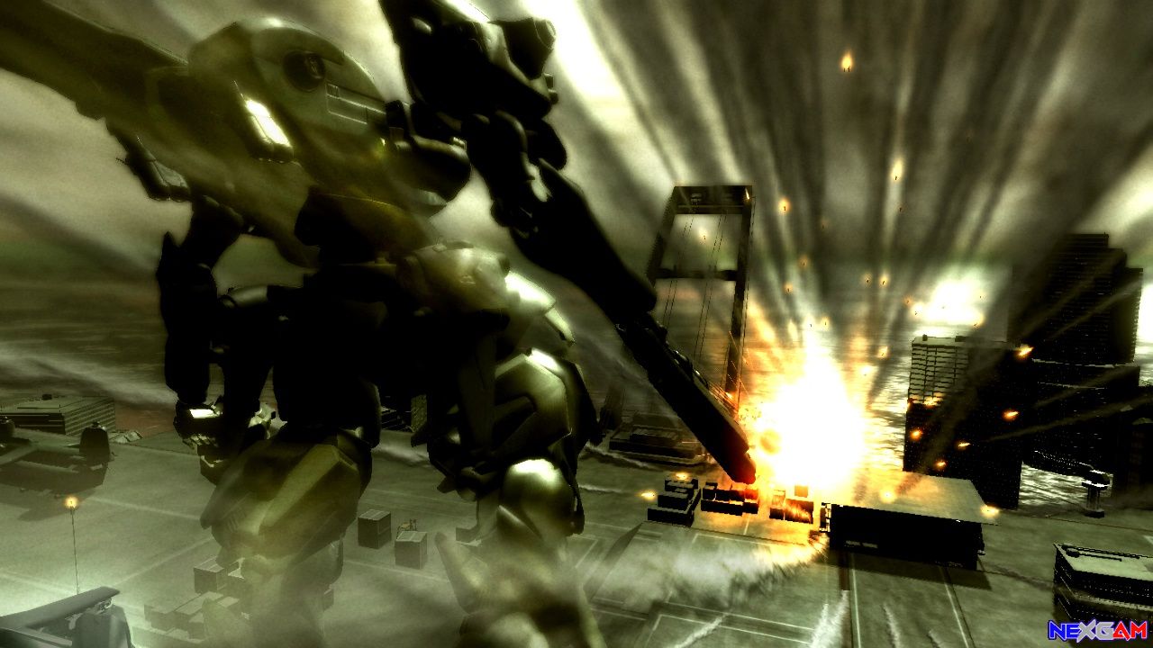 In Armored Core 4 seid ihr Teil eines Squads und bestreitet eure Missionen in schweren Kampfmechs. Die Story ist dabei total belanglos und übermäßig verwirrend ausgefallen. Irgendwelche bösen Jungs, die ebenfalls in Besitz von Mechs und Panzern sind, bekriegen sich. Ihr müsst natürlich euren Kontrahenten das Handwerk legen und wichtige Stützpunkte samt Mechs in Schutt und Asche legen. Bevor jede Mission startet, bekommt ihr ein kurzes Mission-Briefing, indem ihr die Anweisungen für eure Mission erhaltet. In 90% der Fälle könnt ihr diese allerdings getrost überspringen, da ihr sowieso jedes mal alles nur zerstören müsst und es von daher keine große Rolle Spielt. Beim eigentlichen Spiel verfolgt ihr das Geschehen typisch aus der 3rd Person Ansicht. Eine Cockpitansicht gibt es leider nicht. Im Gegensatz zu Chromehounds ist Armored Core deutlich schneller ausgefallen und setzt vermehrt auf Daueraction. Während sich eure Mechs bei CH fast ausschließlich mit ihren zwei bzw. vier Beinen fortbewegen, sind bei AC eure Stahlkolosse mit einer Art Booster ausgerüstet, der es euch ermöglicht über dem Boden zu schweben – und das nicht gerade langsam. Es ist außerdem möglich komplett abzuheben und so lange der Antrieb ausreicht durch die Luft zu fliegen.