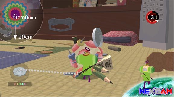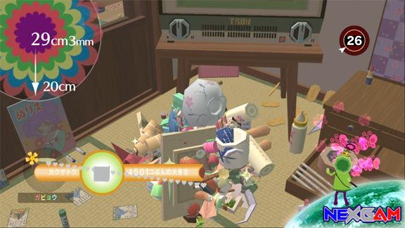 Hört sich krank an? Ist es auch. Aber natürlich ist es nicht so einfach getan mit dem sinnlosen darüber Rollen, das wäre auch zu einfach, denn wir ihr an meinen Beispielen sicherlich schon gemerkt habt, sind die Größenunterschiede derselben zum Teil beachtlich. Um dem Ganzen jetzt zu mindestens etwas Sinn und theoretischen Schwierigkeit zu geben, können wir nur Sachen einsammeln, die entweder kleiner oder nicht viel größer sind, als unser aktueller Katamari. Selbiger vergrößert sich natürlich ständig beim Aufsammeln und verändert auch sein Aussehen, so dass man jederzeit schön erkennen kann was so an ihm klebt. In bestimmten Größenabständen macht er dabei einen Sprung und wir haben so das Signal, dass er einen Level höher gestiegen ist. Dabei öffnen sich auch nach und nach neue Teilbereiche des Levels. Dieser Umstand setzt auch theoretisch ein gewisses überlegtes Vorgehen voraus, so sollte man sich eigentlich gewisse Bahnen zurechtlegen, in denen man die Level angeht um die geforderte Größe des Katamaris, innerhalb des Zeitlimits, zu erreichen. Praktisch ist es leider nicht nötig, es reicht einfach wild durch den Level zu rollen und den Gegenständen nicht auszuweichen. Selbige sind nämlich so vollgestopft mit ihnen, das man fast nicht anders kann als sie zu schaffen.