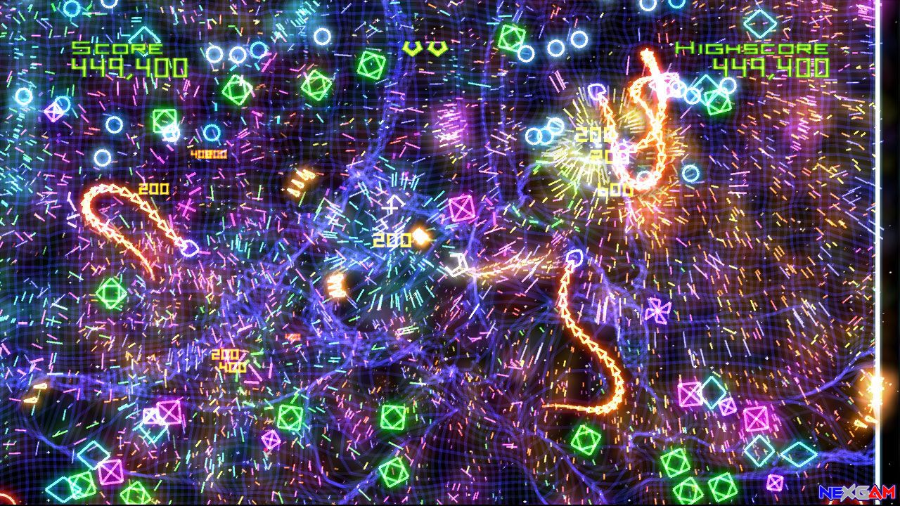 Spielerisch hat sich im Vergleich zum Klassiker nicht viel getan. Technisch wurde der Titel aber einem ordentlichen Face Lift unterzogen und erstrahlt nun in einem ganz neuen Gewand. Mit Massen von Effekten geht hier regelrecht die Post auf eurem Fernseher ab. Schöne Partikeleffekte und der Gebrauch von unzähligen Leuchtfarben lassen das Ganze einem Effektfeuerwerk gleichen. Während die Technik aufpoliert wurde, blieb spielerisch alles beim Alten. Ihr steuert nach wie vor euer kleines Raumschiff mit Hilfe des linken Analogsticks durch das eingeschränkte Spielfeld. Mit dem rechten Stick feuert ihr in die gewünschte Richtung, um die Gegner von euch fern zu halten. Diese unterscheiden sich alle in ihrer Form, Geschwindigkeit und Angriffsweise. Von einfachen, langsamen Vierecken bis hin zu Schlangen und schwarzen Löchern ist alles vertreten, was sich ein Acardespielerherz wünscht.