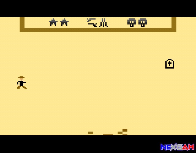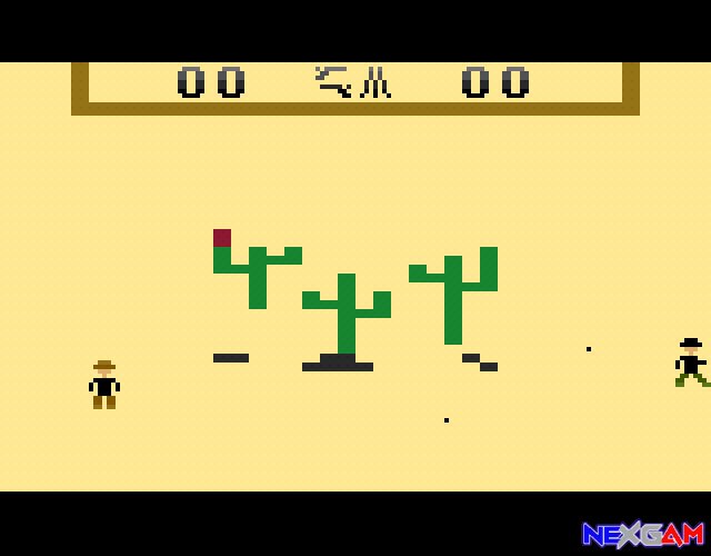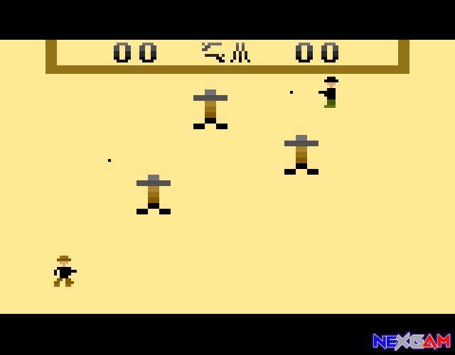 Früher haben sich noch echte Männer mit dem Colt duelliert und im schlechtesten Fall sein Leben gelassen. Heutzutage duelliert man sich auch, aber dafür umso ungefährlicher mit dem Joypad. In Gunfight stehen sich zwei gestandene Cowboys gegenüber und versuchen den Konkurrenten den Garaus zu machen. Dabei gibt es verschiedene Spielmodi: Entweder man wählt den normalen Shootout bei dem jeder Revolverheld zwei Schüsse kurz hintereinander abfeuern kann. Trifft eines der Geschosse den Gegner so verliert er seinen Hut, bei der zweiten Verwundung sein Leben und dem Kontrahenten wird ein Punkt gutgeschrieben. Verzeichnet einer der Akteure sieben Punkte auf seinem Konto, so gewinnt er das Match.