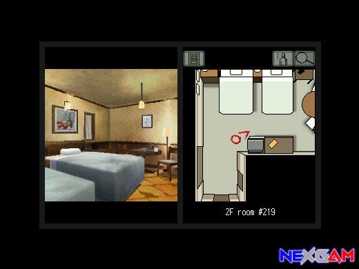 Das typische Film Noir-Szenario ist dabei keinesfalls zufällig gewählt, denn im Verlauf des Spiels wird deutlich, dass die Entwickler wohl große Fans des Filmgenres und klassischer Detektivstories der 40er und 50er Jahre sind. Unterstrichen wird das auch durch den Erzählstil von Hotel Dusk: Room 215. Während des gesamten Spiels haltet ihr den Nintendo DS seitwärts, sprich wie ein geöffnetes Buch. Der Spielablauf wird dabei, ähnlich wie in Phoenix Wright, in verschiedene Phasen unterteilt. So bewegt ihr euch z.B. oft frei im Hotel herum und sucht nach neuen Hinweisen, die euch in der Story weiterführen könnten. Dabei seht ihr auf dem linken Bildschirm des DS die Umgebung in 3D, während auf dem Touchscreen eine einfache Karte aus der Vogelperspektive angezeigt wird. In Kombination mit dem Stylus bewegt ihr Kyle nun auf dem Touchscreen umher kommt zu Gegenständen, mit denen ihr interagieren könnt. Darauf weisen euch Buttons am unteren Bildschirmrand hin: eine Lupe signalisiert z.B., dass ihr eine bestimmte Ecke des Raumes oder einen Gegenstand näher untersuchen könnt.