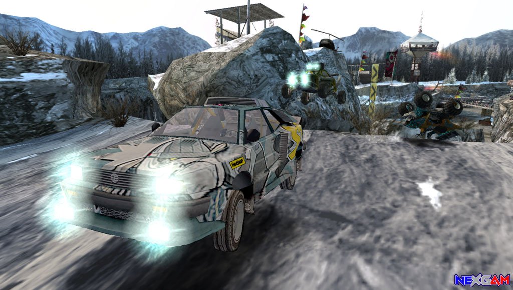 In diesem können auf 12 Strecken, in 100 Missionen die vorhin genannten Errungenschaften erkämpft werden. Die Streckenanzahl klingt erstmal klein, ist sie aber nicht. Zig unterschiedliche Wege gibt es um das Ziel zu erreichen und Langeweile kommt dabei nicht auf. Auch haben es die Strecken in sich, denn Alaska hat für solche Rennen ein sehr raues Klima, Rutschgefahr und Kontrollverlust eures Vehikels stehen an der Tagesordnung. Dabei säumen Gletscherspalten, gefrorene Seen, Berge und Schlammpisten euren Weg. Ist der Dreh zwischen Turboboost – den gibt es auch – und Kurvekratzen raus, dann wird es richtig ernst, da das Abenteuer auf Rädern schnell an Schwierigkeit gewinnt. Dass es kein simulationslastiges Spiel ist, merkt man schnell. Spaß steht hier im Vordergrund und so ließen die Macher gleich die Geschwindigkeitsanzeige weg, nach dem Motto wer bremst hat Angst. Ein bisschen Strategie muss dennoch sein, denn jedes Fahrzeug hat seine eigene Persönlichkeit und Wasser sowie Schnee können zum Kühlen des Motors missbraucht werden. Auch das Abtreiben, Schieben und Schubsen eurer Gegner macht irren Spaß, dann sind aber spektakuläre Unfälle vorprogrammiert, sodass die Autos ihre Teile stochastisch nur so um sich werfen. Wem das nicht reicht, der kann durch rücksichtsloses Hupen Lawinen auslösen oder dem Gegner eine verpassen. Der Balanceakt zwischen den Maschinen ist dabei sehr gut gelungen, sodass der Sieg mit einem Schneepflug gegen ein Buggy dennoch möglich ist.