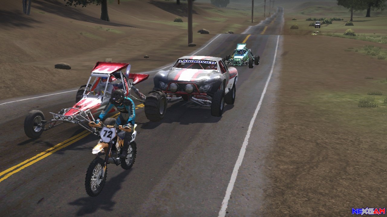 Aber egal welche der beiden Modi man spielt, für jedes gewonnene Rennen schaltet man nicht nur folgende Rennen frei, sondern man verdient auch Credits damit. Leider gibt es aber von Anfang an ein Ungleichgewicht in dem System, zwischen den zu kaufenden Dingen und der Höhe der zu verdienenden Credits, sind die möglichen Einkäufe doch arg beschränkt und dienen nur dem optischen Tuning der Fahrzeuge und des Fahrers. An verfügbaren Fahrzeugen gibt es dagegen für jeden Geschmack etwas. Die Auswahl reicht von Motorrädern und Quads über Wüstenbuggys bis hin zu Monster-Trucks. Jedes der Fahrzeuge hat dabei natürlich ihr eigenes Handling und Fahrverhalten und damit auch Vor- und Nachteile in den einzelnen Rennen. Wobei der verursachte Fahrspaß bei den Fahrzeugen ziemlich unterschiedlich ist. Das Highlight sind ohne Zweifel die Motorräder und die Quads, nicht umsonst geben sie dem Spiel den Namen, die restlichen sind meine Meinung nach hauptsächlich Füllmasse. Aber in dem Fall gilt natürlich die Devise, lieber zu viel Auswahl als zu wenig.