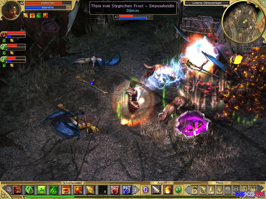Grafik zum Verlieben Teil 2 Wer glaubt, Titan Quest ist ein grafisches Highlight, sollte sich ganz schnell das AddOn anschauen, da hier die Designer noch mal kräftig Hand angelegt haben. Das Totenreich des Hades ist eine surreal wirkende Landschaft mit bunten Farben und Lichtspielen, die das totale Gegenteil zum bekannten Titan Quest-Setting ist. Wabernde Nebel huschen umher und gespenstige Kreaturen bewegen sich in der bedrohlichen Dunkelheit. In den Dungeons beherrschen wieder Mal die grandiosen Schatten und sehenswerten Effekte das Geschehen. Abgerundet wird alles mit scharfen Texturen und flüssigen Animationen. -Imposant!!! Um Immortal Throne in einer Auflösung von 1024x768x32Bit Farbtiefe zu spielen, braucht ihr einen Rechner mit 3GHz, 1024MB RAM und eine Grafikkarte der Klasse GeForce 7800GT oder eine Radeon X850XT. Die Mindestvoraussetzungen sind ein Pentium IV, 1,8GHz/ oder vergleichbarer Athlon, 512MB RAM und eine Grafikkarte der Klasse GeForce 3/Radeon 8500. Das Spiel nimmt zusammen mit dem AddOn 8,3GB Festplattenspeicher ein.