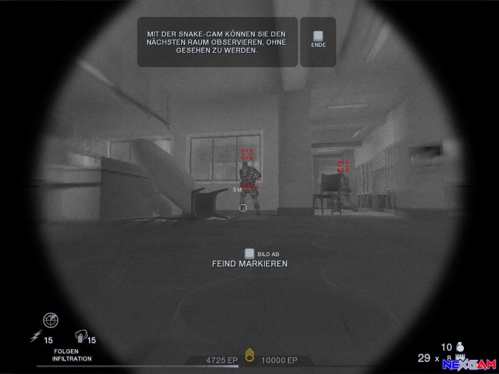 Möchtet ihr es ganz genau nehmen und laut Vorschrift die bösen Jungs in den Terroristenhimmel schicken, nehmt ihr eure Snakecam und steckt sie unter die Tür, um mittels Mausklick das Ziel anzuvisieren. Aber das wird nicht oft nötig sein, da sich die recht dumme K.I. gerne wirklich überrumpeln lässt. Dafür treten die Gegner teilweise in Massen auf, was sie dann auch recht gefährlich macht. Hierbei werdet ihr oft merken, dass eure Squadleader Figur allein auf weiter Flur steht, da die künstliche Intelligenz eurer Teamkameraden ist nicht viel besser ist, als die der Gegner. So ist das verhacken an Kanten und Objekten oft an der Tagesordnung oder eure Teamkollegen übersehen teilweise selbst Horden an Gegnern. Die Levelpassagen weisen leider wenig Freiheiten auf und somit ist stupides ballern im Geradeausschritt angesagt.