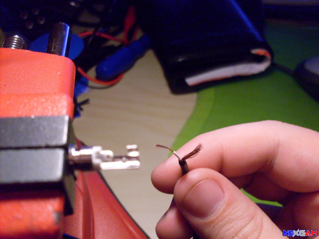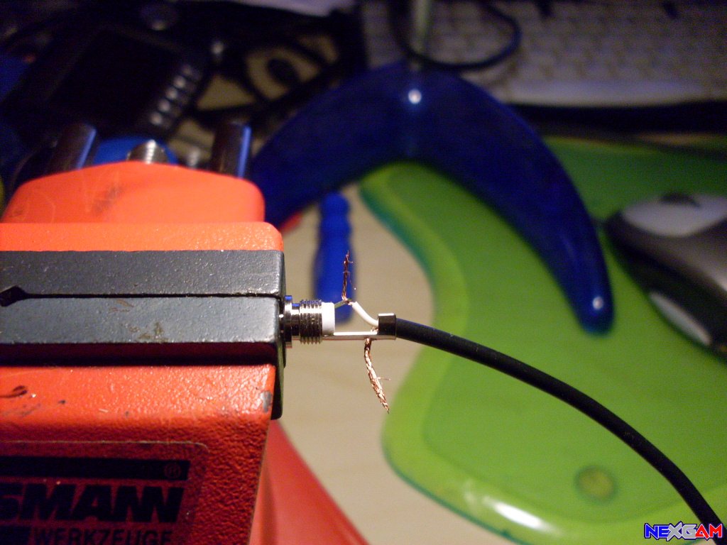Ansonsten messen oder probieren (hier übernimmt Planet-Gizmondo natürlich keine Haftung). Nachdem wir also herausgefunden haben, dass die innere Leitung den Pluspol führt, verdrehen wir beide Leitungen ein wenig und fummeln diese durch die feinen Öffnungen, sodass die innere Isolierung fast das Metall berührt.