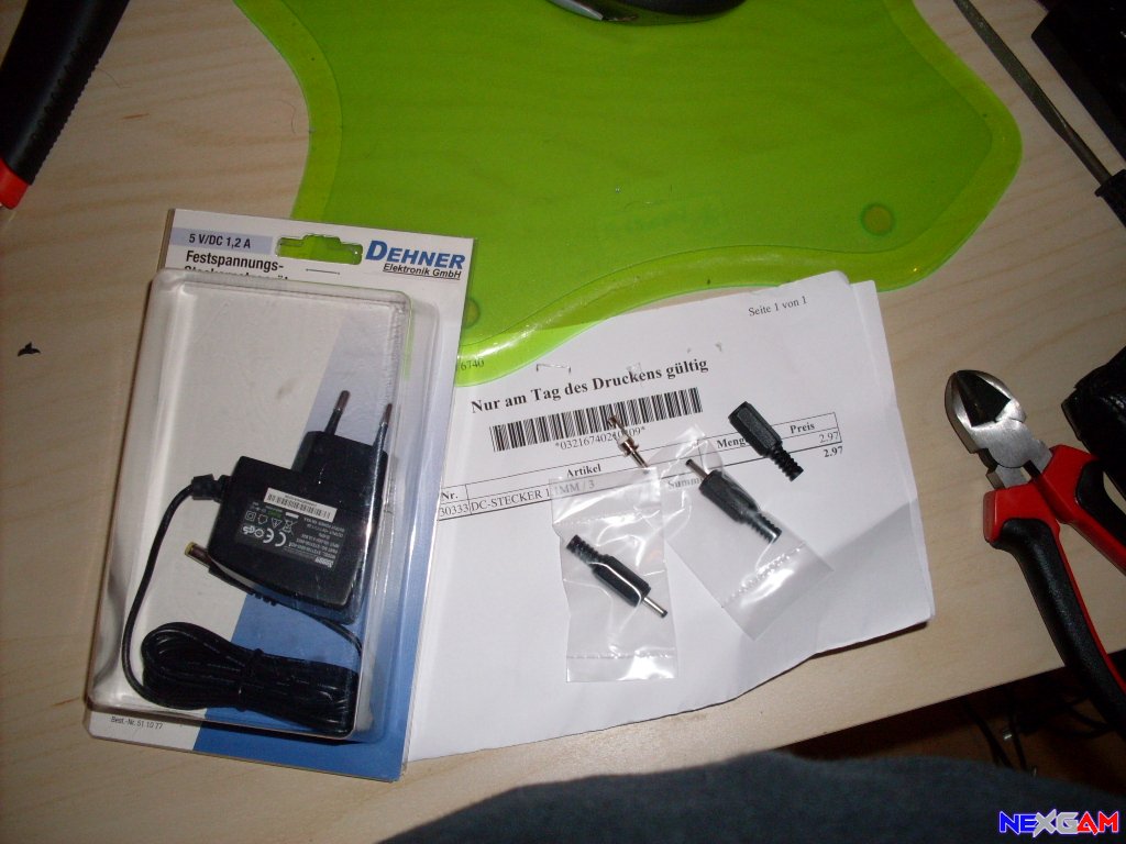 Material: Festspannungsnetzgerät mit 5 V und 1,2 A von Conrad für rund 9 € und DC-Stecker 1,1/3 mm 0,99 € (vorzugsweise mehrere, für eventuelle Unfälle)