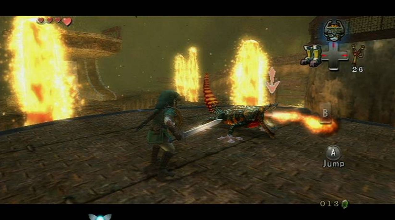 Die Hinweise sind rarer gesät als noch bei Ocarina of Time, wo Fee Navy mit Rat und Tat zur Seite stand. Das resultiert in einem höheren Schwierigkeitsgrad. Übertrieben hat man es glücklicherweise nicht und letztlich stehen auch dieses Mal eine ganze Reihe hilfreicher Items bereit, das Abenteurerleben zu vereinfachen. Neben alten Bekannten wie dem Boomerang, Pfeil & Bogen oder der Öllampe auch neue Gegenstände. Wobei selbst alte Items mit zusätzlichen Fähigkeiten ausgestattet wurden. Pfeil & Bomben können z. B. kombiniert als todbringendes Geschoss eingesetzt werden. Neugierig war ich auf die exklusiven Features der Wii-Fassung. Kollege Kai testete bereits die GameCube-Fassung und war begeistert. Ist das kämpfen mit Wiimote besser als per Pad? Ermüdet man dabei nicht schnell?