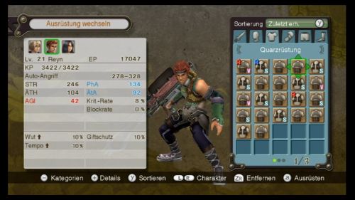 Das hat auch was mit dem Belohnungen zu tun, die gefallene Feinde übrig lassen. So erscheinen nach jedem besiegten Gegner Schatztruhen, die allerlei Wertsachen beinhalten: wertvolle Items, Kräuter, Kristalle, Wafden oder Rüstungsgegenstände. Der Clou: wer fleißig kämpft und seine Charaktere levelt wird also mit vielen brauchbaren Gegenständen belohnt. Waffen und Rüstungen können zum Beispiel gleich ausgerüstet werden oder aber in den vielen Kolonien (den Städten Xenoblades) getauscht, bzw. verkauft werden. Löblich ist, dass man neue Ausrüstungsgegenstände und Waffen auf den Charakteren auch sieht. Und das sogar in den Zwischensequenzen.