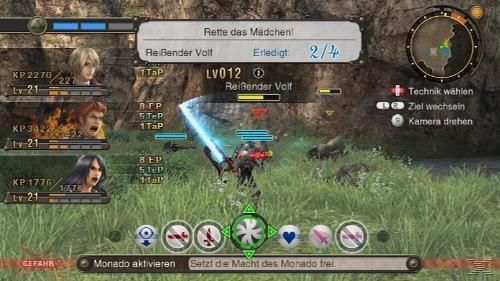 Da wäre zum anderen noch das dynamische Kampfsystem, dass euch einiges abverlangen wird. Alle Gegner laufen auf dem Land umher und können von euch per Knopfdruck anviesiert und attackiert werden. Das Kampfsystem geht sofort in Fleisch und Blut über und mag anfangs recht oberflächlich erscheinen. So schnetzelt ihr euch euren Weg zum nächsten Ziel, welches durch einen Pfeil markiert ist, levelt auf und setzt hier und da spezielle Technicken ein, die nichts anderes darstellen als Spezialattacken oder Zaubersprüche. Aber schon bald merkt ihr, dass da noch viel mehr hinter steckt, denn es kommen immer wieder neue Tutorials, die euch mehr und mehr über das immer komplexer werdende Kampfsystem aufklären. Das fängt bei den verschiedenen Monstertypen an. So gibt es Monster, die fröhlich in den Tag hinein leben und euch eigentlich nichts böses wollen. Attacktert ihr sie nicht von selbst, werden sie euch nichts tun. Anders sieht es da bei den visuellen Typen aus. Diese Monster greifen euch sofort an, sobald ihr in deren Sichtfeld lauft. Später macht ihr Bekanntschaft mit Gegnern, die auf Geräusche empfindlich sind und euch sofort attakieren, wenn sie euch hören. Und dadurch, dass die Monster immer frei herum laufen, kann es sogar passieren, dass ihr einem Gegner gegenübersteht, dessen Level um ein Vielfaches euren aktuellen Grad übersteigt. Dann heißt es Beine in die Hand nehmen und das Weite suchen.