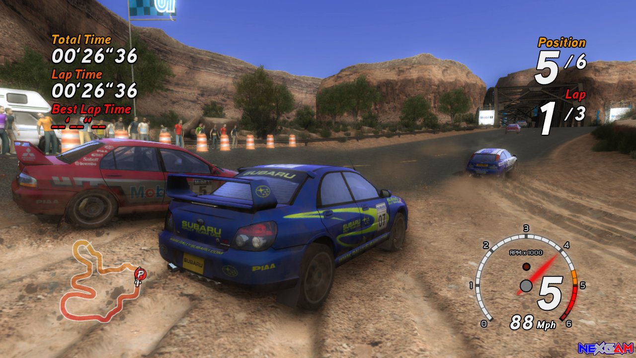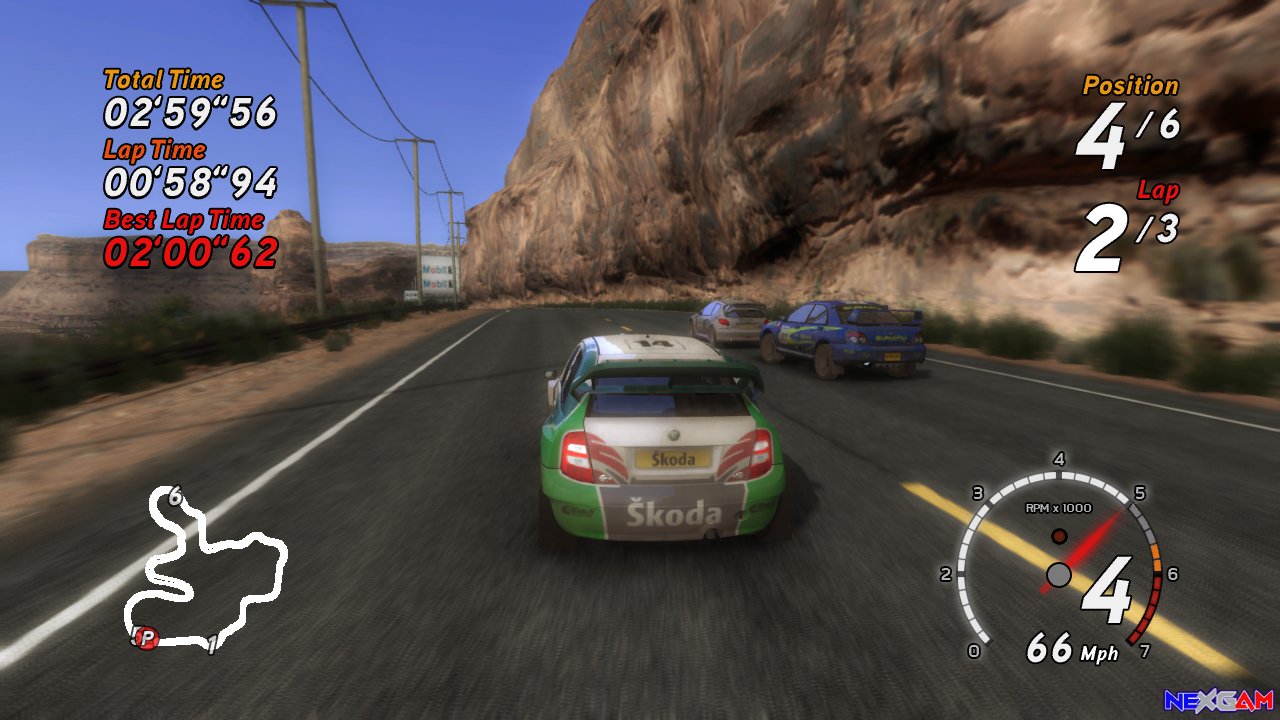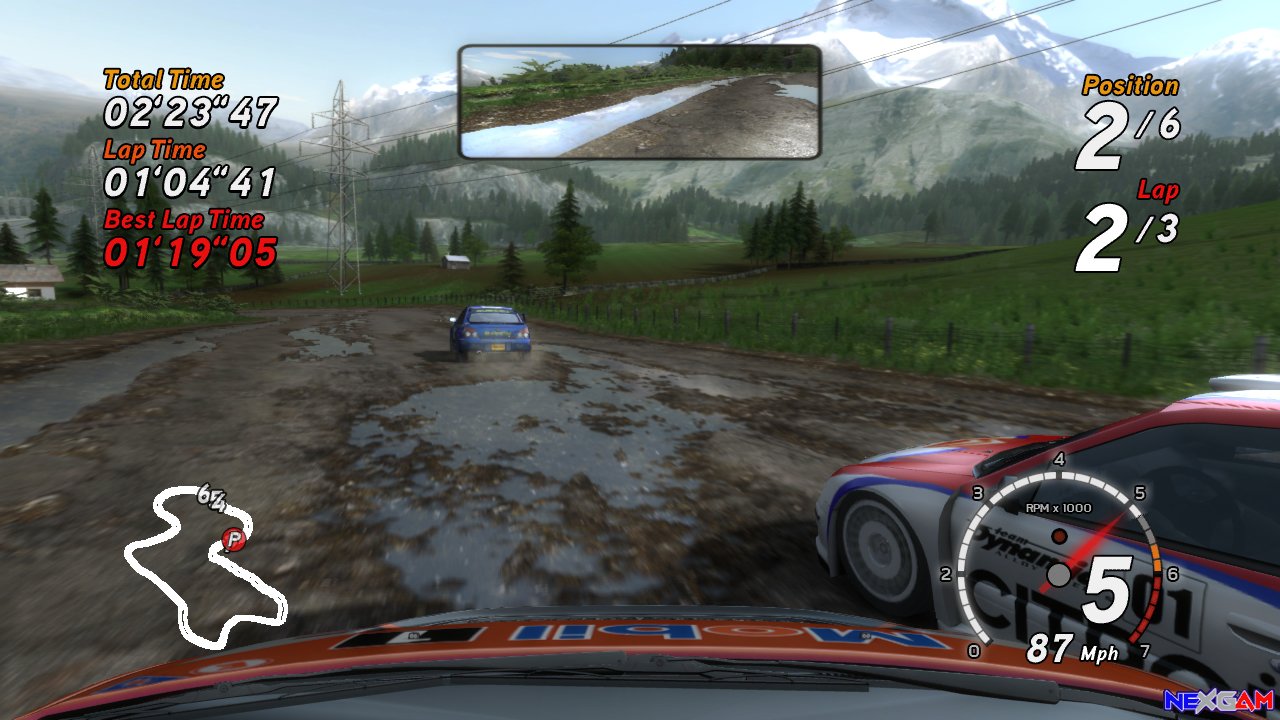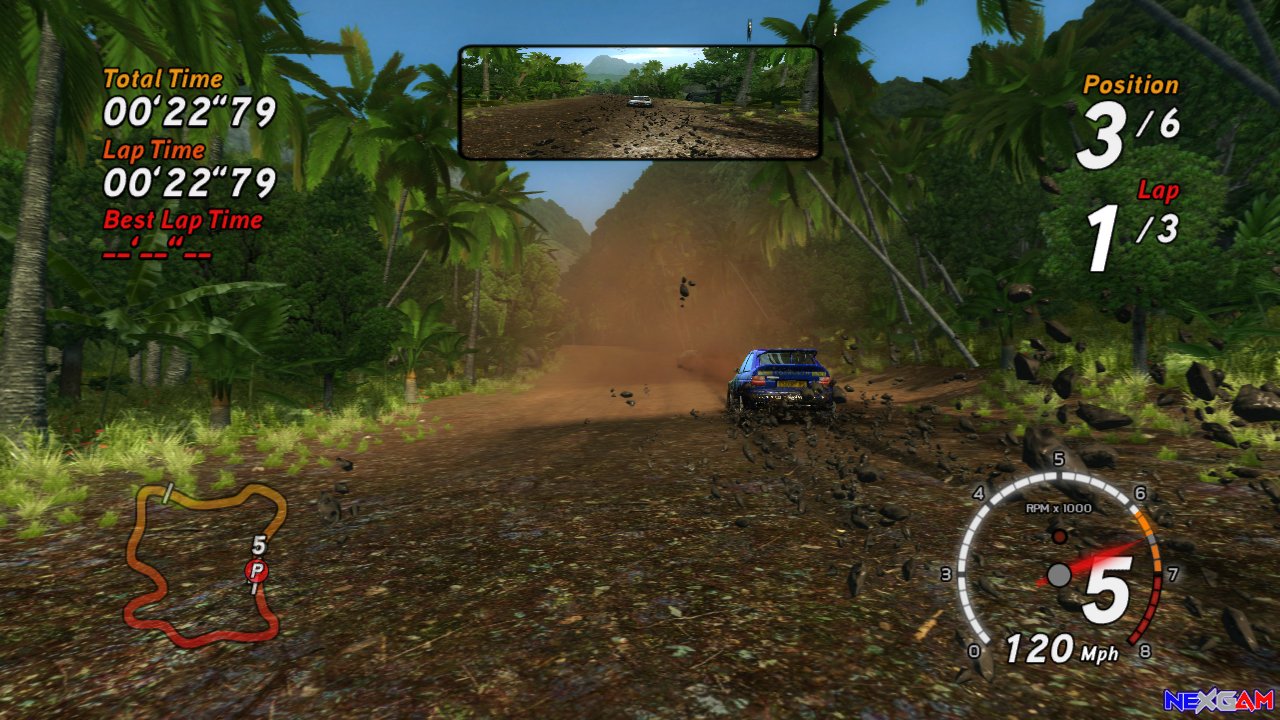 Vor jedem Rennen solltet ihr abhängig vom Untergrund der Rennstrecken das passende Setting am Auto einstellen, um die Siegchancen zu erhöhen. Hierbei steht die Option Rally für mehr Bodenhaftung und Straße für schnellere Beschleunigung sowie höhere Höchstgeschwindigkeit zur Verfügung. Von Start her seid ihr immer der Letztplatzierte und müsst euch jeweils in drei Runden ganz nach vorne arbeiten, was dank der tollen Steuerung, der hervorragenden K.I. und dem sehr guten Streckendesign in echte Arbeit ausartet. Hinzu kommen jetzt noch dank Deformationen des Untergrunds, dass jede Runde sich auf Matsch, Schnee und Sand komplett anders fährt als zuvor. Dazu kommt ununterbrochenes Rappeln, falls euer Eingabegerät über eine Rumblefunktion verfügt. Auch spielerisch sind die Deformationen spürbar und so sollten erstellte Wasserpfützen gemieden werden, um nicht eine Verlangsamung der Geschwindigkeit zu riskieren. Wie vorhin schon erwähnt, ist die Anzahl der Fahrzeuge recht spärlich, aber durch das schnelle Weiterkommen werden an die 30 Fahrzeuge freigeschaltet, wobei Konzeptfahrzeuge oder andere Rallyflitzer ihren Auftritt haben.