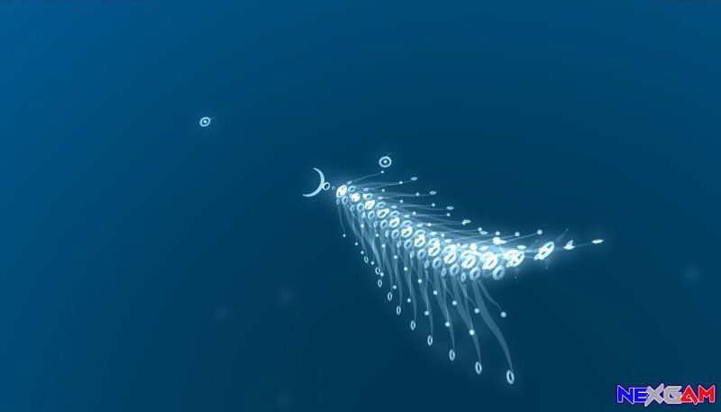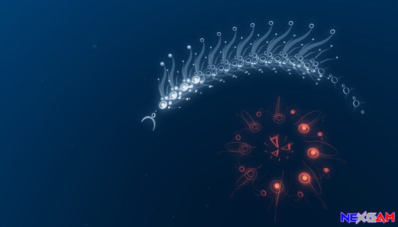 Spielprinzip und Setting sind schnell erklärt: Ihr übernehmt die Geschicke eines Minifisches/Larve/Einzeller/Amöben-Dingsbums und steuert es durch die Weiten des Ozeans. Zumindest lässt sich der sterile blaue Hintergrund als entsprechendes Gewässer interpretieren. Umhertreibende Zellen können verspeist werden und wirken sich unmittelbar auf Größe und Form eurer Mutation aus. Wachstumszellen bescheren euch zusätzliche Glieder und Segmente, andere bauen vorhandene Körperteile weiter aus. Ab und an schwimmt ein nicht minder ansehnliches Getier durchs Bild, welches ihr euch beherzt einverleiben könnt. Zu diesem Zweck zielt ihr auf die einzelnen Körperpartien des Opfers, wurden alle berührt endet das triste Dasein eures Futters in einem Zellenhaufen.