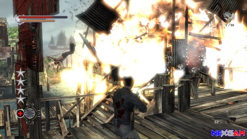 Unser Superbulle Tequila hat natürlich noch ganz andere Sachen auf dem Kasten. So ist es ihm möglich, mit nahezu sämtlichem Inventar in den Leveln von Stranglehold zu interagieren und dadurch richtig witzige Situationen auf den Bildschirm zu zaubern. Wenn ihr z.B. auf einen Tisch zu lauft habt ihr die Wahl über ihn hinweg zu rutschen (gerne mit gleichzeitigem Geballere, versteht sich) oder ihn um zutreten, so dass er euch für kurze Zeit Deckung bietet. Wände entlang laufen, auf Treppengeländern balancieren, an Lampen hangeln – Tequila hat's einfach drauf und durch die ganze Akrobatik wird Stranglehold dann doch noch mehr als ein einfacher Max Payne-Klon. Zur Interaktion mit der Umgebung gehören auch Schilder, die ihr abschießen könnt, um damit darunter stehende Gegner auszuschalten. Für all diese coolen Moves gibt es schließlich Sterne, die eine Anzeige in der unteren linken Bildschirmecke auffüllen. Diese zeigt die vier Tequila Bombs an: Spezialfähigkeiten, die ihr euch erst verdienen müsst. Dazu gehört die Fähigkeit ein wenig Lebensenergie selber wiederherzustellen, ein Scharfschützenmodus sowie zwei Möglichkeiten um möglichst viele Gegner auf kürzeste Zeit auszuschalten.
