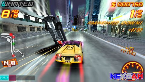 Steuerungstechnisch braucht ihr kein Fingerakrobat zu sein, man begnügt sich mit Gas geben, bremsen und Nitrostufe. Gelenkt wird entweder per Digikreuz oder Analognub. Die nötigen N²O-Einheiten liegen in 3er Paketen auf der Straße umher und werden durch simples Drüberfahren aufgesammelt. Ihr könnt bis zu 3 Nitros auf einmal einsetzen und dadurch enorm beschleunigen, dadurch verlängert sich nicht nur eure Sprungweite, auch Gegnerische Fahrzeuge fliegen damit Ruckzuck aus dem Rennen und ihr kassiert einen Geldbonus. Leider ist der Spaß schon nach wenigen Sekunden vorbei. Enge Kurven werden geschickt per Drift genommen, auch hier geht die Steuerung leicht von der Hand. Als kritisch kann man aber die KI der Opponenten einstufen, die teils mehr als dumm die Strecke abfährt und euch somit leichtes Spiel lässt. Kaum eine Strecke, die ihr selbst in höheren Kategorien nicht auf Anhieb schafft. Wer die Strecken dann auch noch im Schlaf auswendig kennt, hängt schon in Kürze alle Gegner spielend ab.