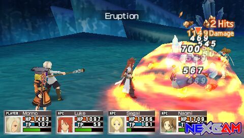 Fertig ausgerüstet metzelt sich eure Truppe durch die zahllosen Verliese und Grotten, in denen es vor Feindgetier nur so wimmelt. Löblicherweise tummeln sich die Gegner sichtbar in den verschlungenen Gängen, jeder Kampf kann also auf Wunsch umgangen werden. Bei Feindkontakt switched der Screen - mit erfreulich kurzen Ladezeiten - in den Kampfbildschirm. Hier feiert das "Flex Range Linear Motion Battle System" sein Revival, welches in Tales of Abyss erstmals eingeführt wurde. Anstatt nun strikt Runden basierend seine Attacken zu wählen, erwartet den Hosentaschen-Rollenspieler ein Echtzeit-Kampfsystem, welches euch frei über das Schlachtfeld hüpfen lässt. Das Verhalten der verbündeten Soldateska lässt sich jederzeit während des Kampfes der jeweiligen Situation anpassen. Eindrucksvoll animierte Attacken und Kombinationen verschlingen gierig TP, die sich jedoch durch konsequenten Item-Einsatz regenerieren lassen. Leider wurde das Inventar auf 15 Einheiten je Gegenstand beschränkt, was vor allem bei langwierigen Bossfights für Frust sorgen kann.