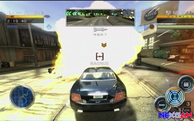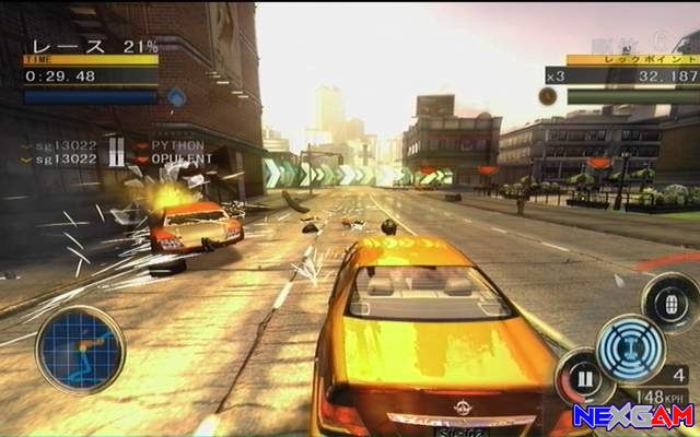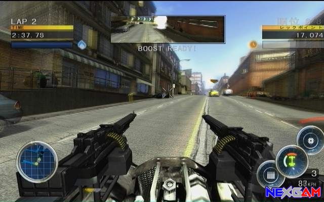 Im Kariermodus fahrt ihr nach und nach immer wieder Rennen in 16 verschiedenen Klassen. Dabei gibt es 5 verschiedene Renntypen: Hin-und-zurück – Ein Rennen bis zu einem bestimmten Punkt der Strecke samt Rückfahrt zum Start, Randale – hier entledigt ihr euch unter einem Zeitlimit einer bestimmter Zahl von Zivilfahrzeugen, Punkt-zu-Punkt – klassisches Checkpoint Rennen, Rundkurs – klassisches Rundrennen mit mehreren Runden und Runden-Knockouts – seht zu dass ihr nicht als letzter die Runde beendet, sonst seit ihr raus. Die Steuerung ist dabei etwas voller als in anderen Rennspielen, denn Primär- und Sekundärwaffe, Booster, Unwreckmodus. Selbszerstörung und die klassischen Rennsteuerung will irgendwo untergebracht werden. Allerdings könnt ihr euch in den optionen euer eigenes Schema zurecht basteln.