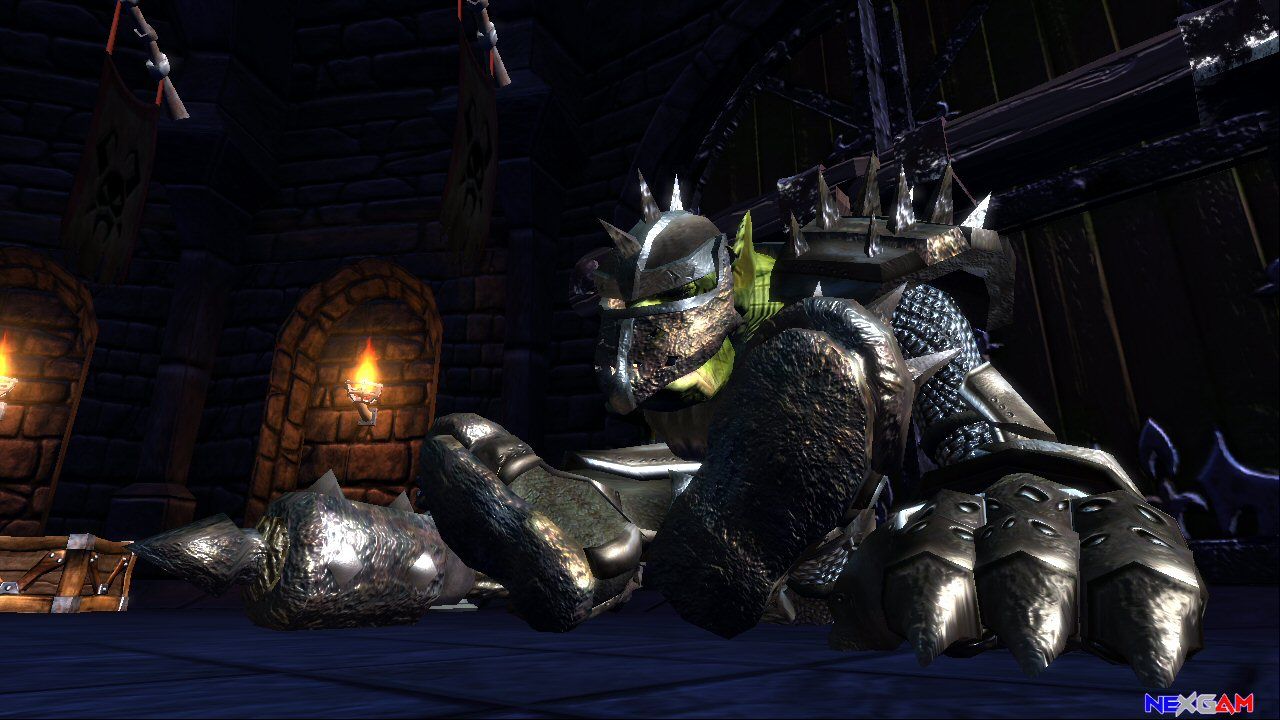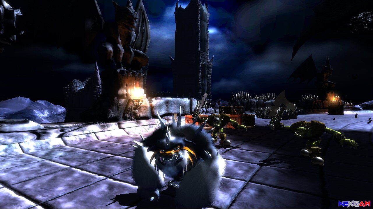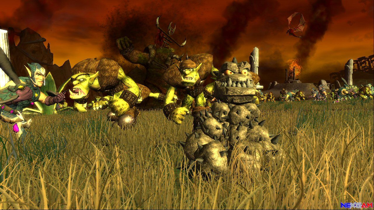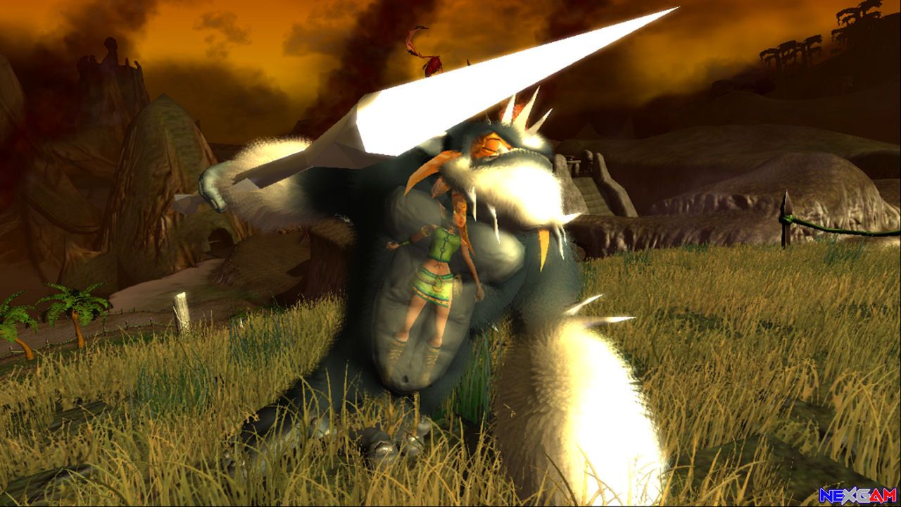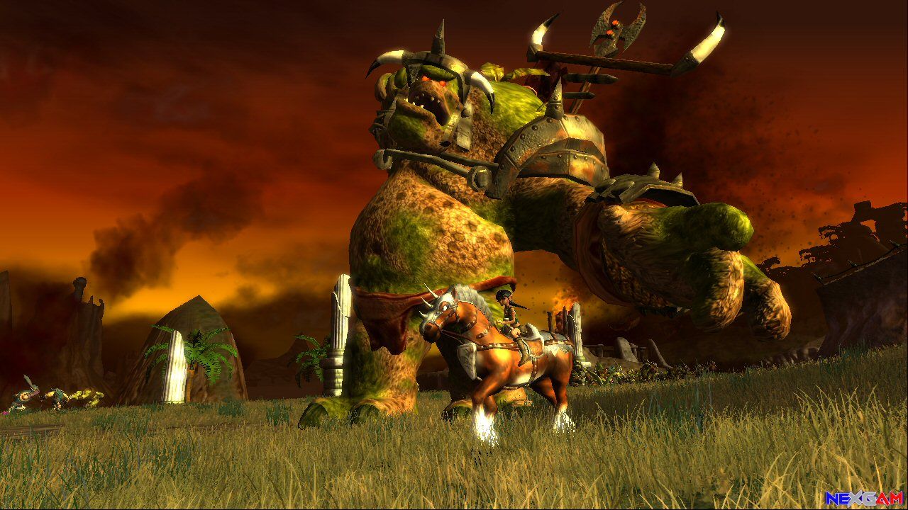 Unterbrochen wird dieser rote Faden, der sich wie gesagt durchs gesamte Spiel zieht, stellenweise durch große Massenschlachten, in denen die Trolle diverse Artefakte im Ödland angreifen. An dieser Stelle merkt ihr, dass Legend of Zelda: Ocarina of Time auch an den Jungs von Rare nicht vorbeigegangen ist. Da es sich beim Ödland um die weitläufigste Fläche in der Welt von Kameo handelt, wurde ein nützliches Pferd ins Spiel gebracht, auf dessen Rücken ihr um einiges zügiger voran kommt. Charakteristisch für jene Teile des Spiels sind riesige Massen von Trollen, durch die ihr einfach gemütlich durchreitet, sowie einige Bildschirm füllende annormale Gegner wie Riesentrolle, Panzer oder Katapulte. Euer Ziel in diesen Sequenzen ist es, das Artefakt zu beschützen. Irgendwann – mitten im Spiel – lässt euch Ortho auf einmal wissen, dass im Ödland gerade ein Angriff stattfindet. Am linken Bildschirmrand erscheint dann eine Lebensanzeige des Artefakts – nun liegt es an euch möglichst schnell dorthin zu kommen, egal wo ihr gerade seid. Sich den in einem Abschnitt gegangenen Weg zu merken kommt euch also im Nachhinein zu gute.