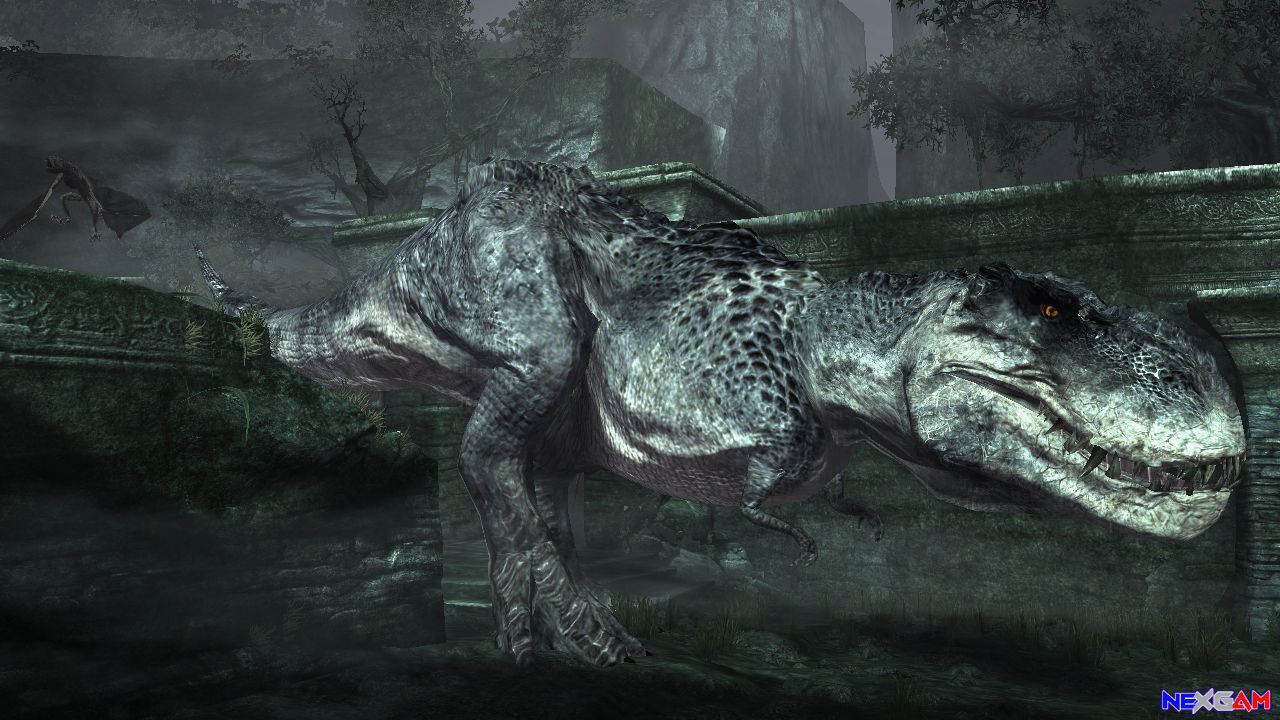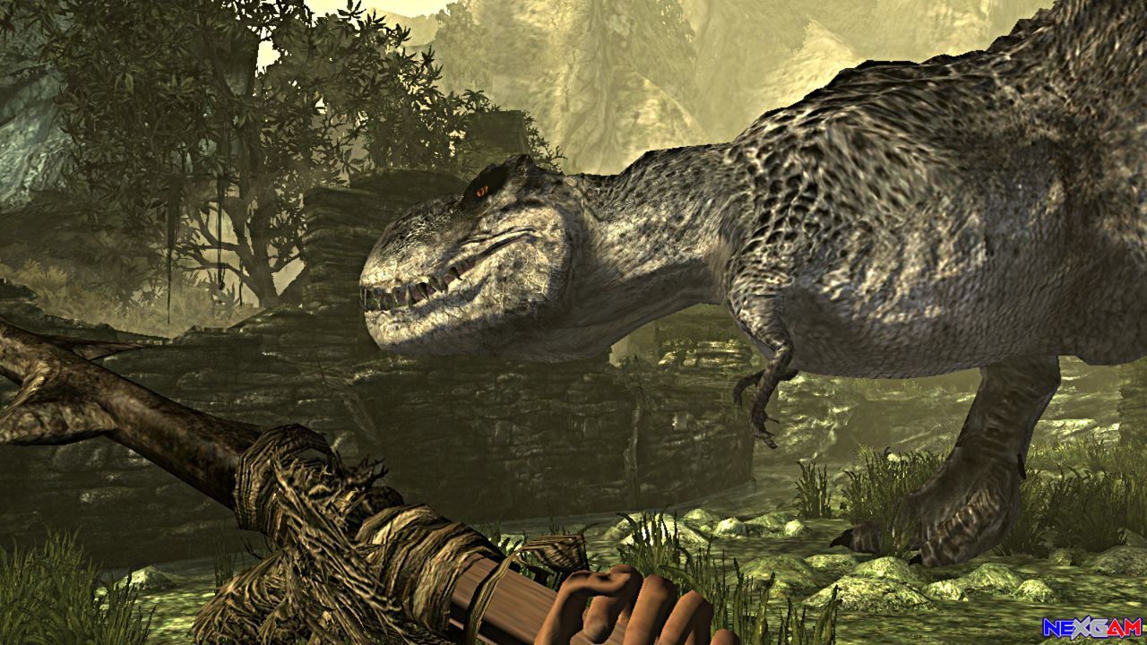 Kleinere Schalterrätsel und Suchaktionen bringen ein bischen Abwechslung ins sehr lineare Gameplay. Doch es ist die Atmosphäre und die Inszenierung, die diesen Titel so sehenswert macht. Denn was diese beiden Elemente angeht ist das Spiel ganz groß – und das nicht nur in vereinzelten Szenen. Trotzdem sind die Highlights natürlich an bestimmte Ereignisse geknüpft, so z.B. eure erste Begegnung mit einem T-Rex. Zunächst hört und fühlt ihr nur das Stampfen, völlig ahnungslos was denn nun schon wieder furchtbares passieren mag. Und dann steht er plötzlich vor euch, mit weit aufgerissenem Maul und so laut schreiend, dass ihr Angst um die verdiente Nachtruhe der Nachbarn habt. Dass die Tatsache, dass ihr nur mit einem Speer in der Hand vor einer der schrecklichsten Kreaturen der Erdgeschichte steht, die Spannung weiter anheizt, sollte logisch erscheinen.