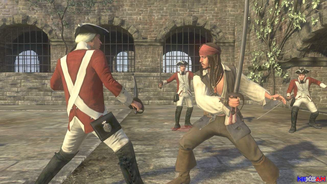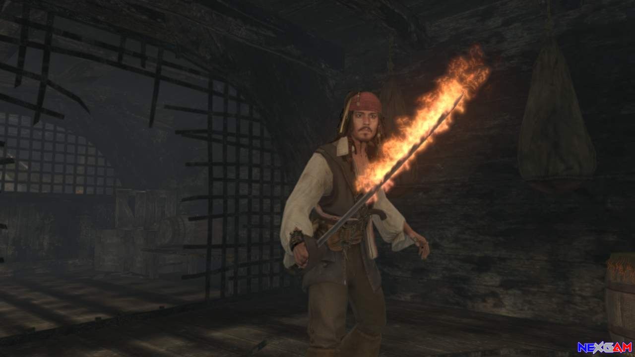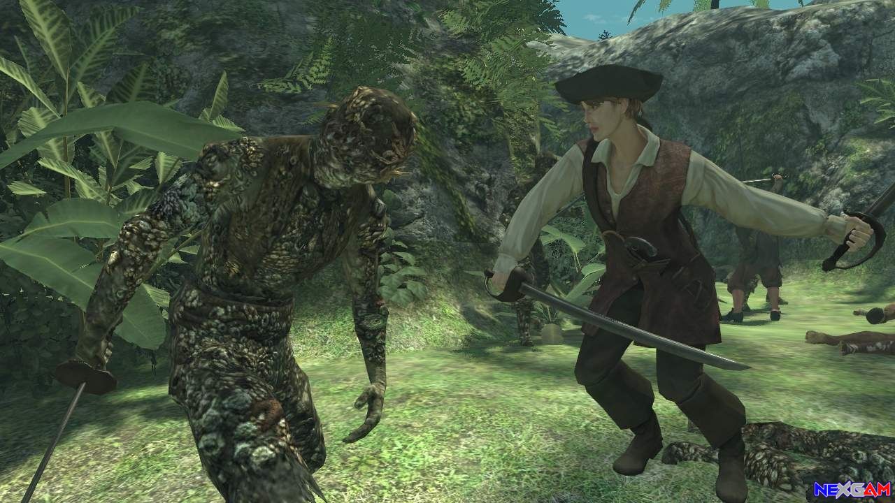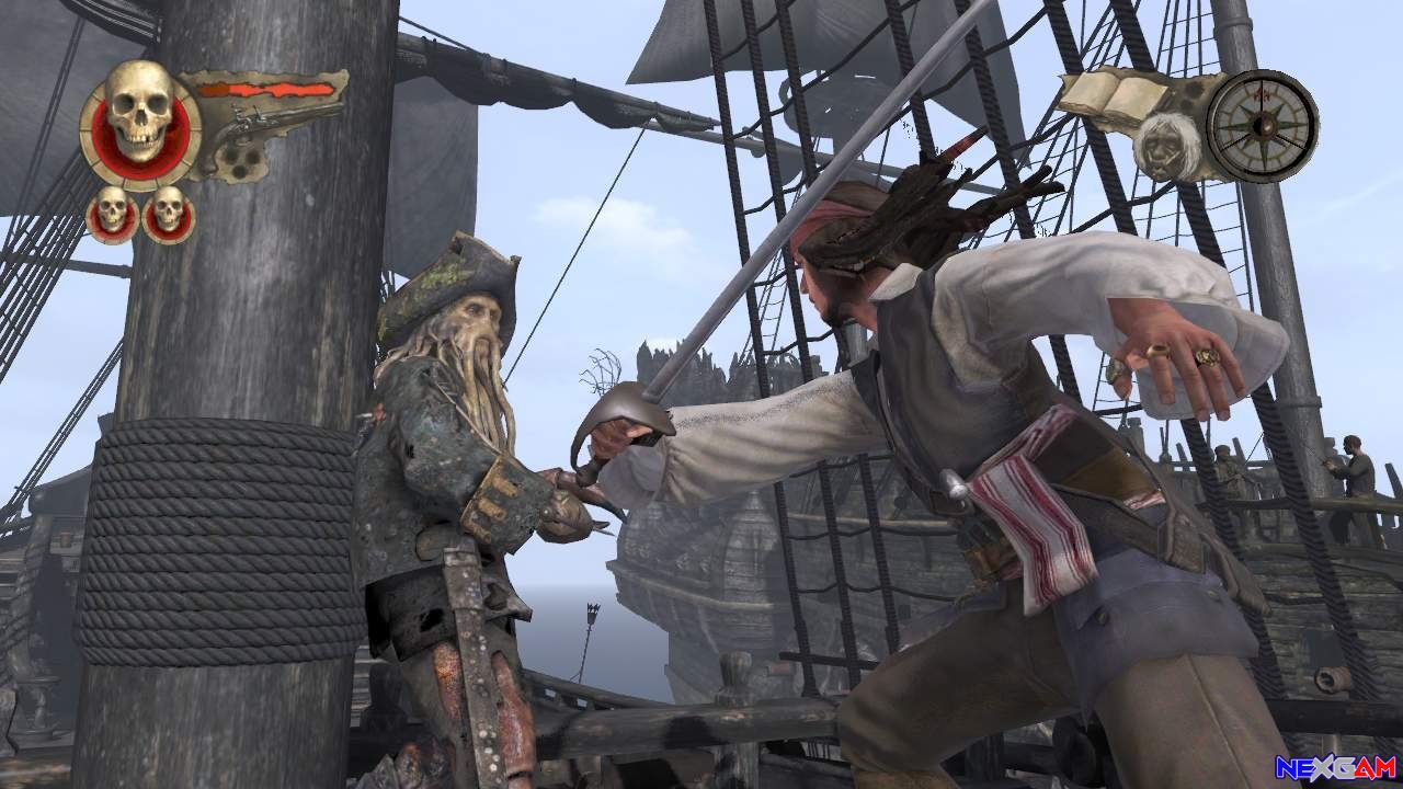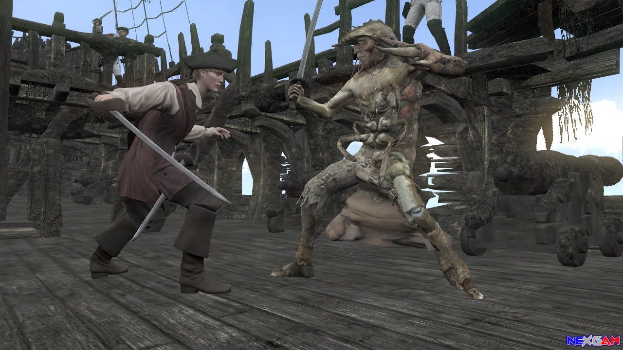 Wie schon bei Spider-Man 3 wird auch beim neuen Fluch der Karibik-Videospiel nicht nur die Story des namensgebenden Streifens nachgespielt. Während der ersten Hälfte des Spiels folgt ihr nämlich der Handlung aus Pirates of the Caribbean 2: Dead Man’s Chest, erst danach geht es mit den Geschehnissen aus dem aktuellen Kinofilm, At World’s End, weiter. Zunächst seid ihr also als Jack Sparrow unterwegs, der nur ungern zur komischen Sippe des Fliegenden Holländers gehören will und deshalb die Truhe mit dem Herz von Davy Jones finden muss. Während ihr auch in den weiteren Teilen des Spiels meist in die Rolle von Captain Sparrow schlüpft, kommt der Rest der Besetzung auch nicht zu kurz. Hin und wieder steuert ihr auch Elizabeth, Will und weitere Charaktere aus den Filmen. An einigen Stellen im Spiel habt ihr sogar die Wahl zwischen mehreren Charakteren. Das geschieht meist in größeren, offenen Schlachten. Die anderen Charaktere werden von der CPU gesteuert, doch über das digitale Steuerkreuz könnt ihr den von euch kontrollierten Protagonisten wechseln. In diesen Situationen ist es stets Pflicht, dass alle Anwesenden überleben, weshalb euch auch am Bildschirmrand immer angezeigt wird, wie es um die Gesundheit der alternativ spielbaren Figuren steht. In Sachen Steuerung unterscheiden sich die verschiedenen Charaktere übrigens nicht voneinander.