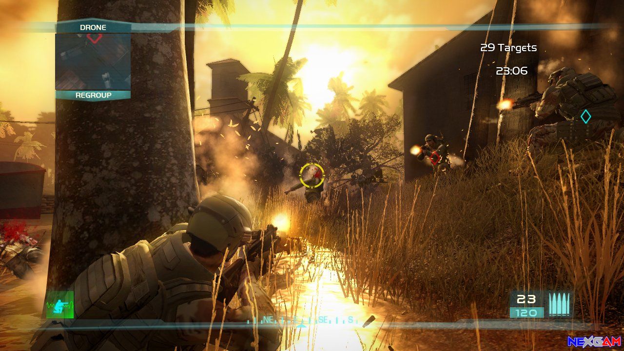 GRAW wäre nicht GRAW, wenn ich ständig alleine unterwegs wärt. In vielen Missionen des Spiels werden euch mindestens drei weitere Ghosts an die Seite gestellt und es liegt an euch, die Kollegen sinnvoll einzusetzen. Hier gibt es einige Neuerungen im Vergleich zum Vorgänger, wodurch das Kommandieren einfacher wird. Wenn ihr auf den rechten Bumper drückt, seht ihr auf dem ganzen Bildschirm, was der ausgewählte Teamkollege sieht. Während beim Vorgänger nur ein kleines Bildchen im HUD die Sicht der anderen Ghosts anzeigte, habt ihr nun die komplette Übersicht und seid quasi an zwei Stellen gleichzeitig. In der Praxis läuft das dann so, dass ihr eure Jungs wie gehabt via digitalem Steuerkreuz an eine neue Position schickt. Sobald sie jene bezogen haben und in Deckung gegangen sind, schaltet ihr via RB die Sicht ein und könnt schauen, wo sich die gegnerischen Rebellen befinden. Von hier aus könnt ihr dann direkt festlegen, auf wen die Ghosts schießen sollen.