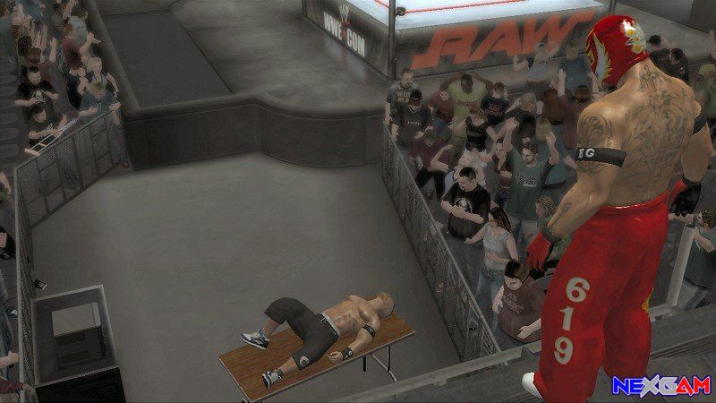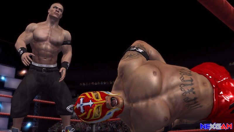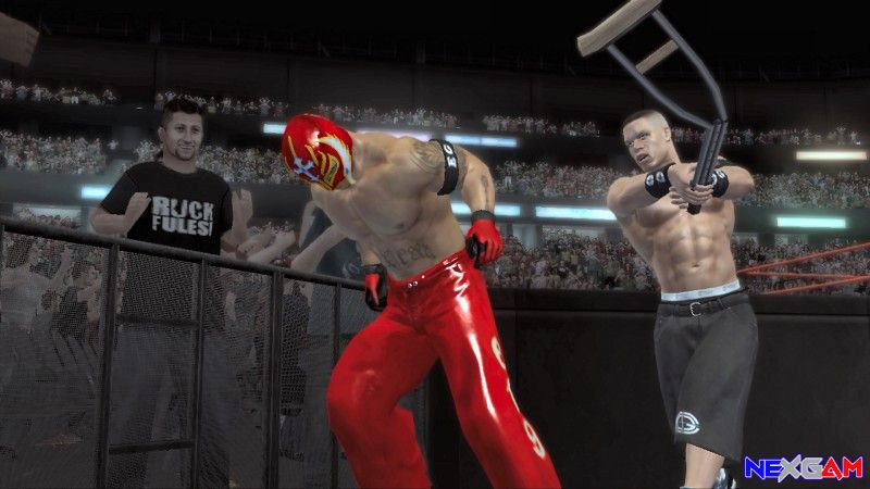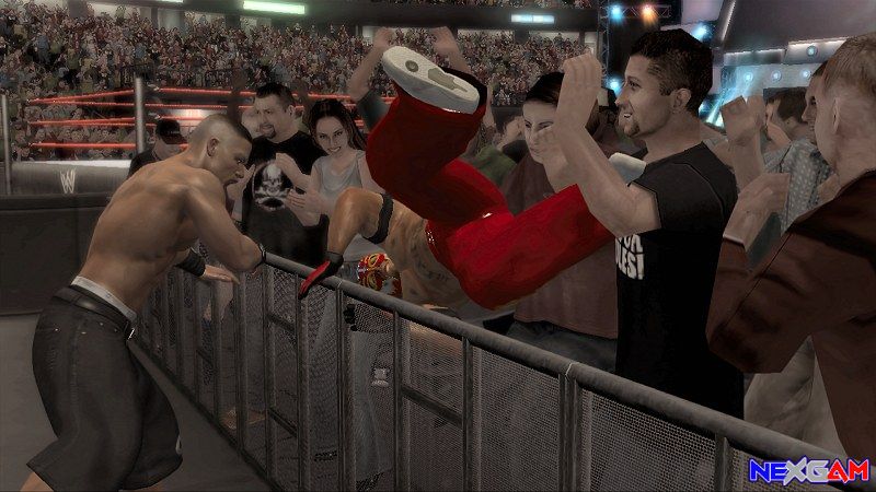 Etwas, was mir auch weniger gefallen hat, ist das Stamina-System, das Kenner der Serie bekannt sein dürfte. An für sich ist es ja eine sinnvolle Sache, dass nach einem harten Kampf langsam die Ausdauer schwindet. Dass die Profi-Wrestler sich schon nach drei Faustschlägen und einem Wurf kaum noch auf den Beinen halten können und zusammenbrechen, find ich dann aber etwas übertrieben. Per druck auf die B-Taste eures 360-Controllers könnt ihr langsam wieder die Ausdauer auffüllen oder ihr schaltet dieses „Feature“ einfach ab, so wie ich. Das große Plus von Smackdown vs. Raw ist natürlich die wirklich coole Präsentation, auch wenn diese noch einen großen Schritt von der Perfektion entfernt ist. Inszeniert ist es allerdings wirklich großartig und es wurde auf viele Details, die man aus den Fernsehübertragungen kennt, wert gelegt. Die schönen Lichteffekte und vor allem der extrem coole Effekt der Nebelmaschinen können sich wirklich sehen lassen. Leider wirken manche Animationen recht billig und stock steif. Auch die Geräusche der Fans gehen meistens total unter und schmälern die gute Präsentation.