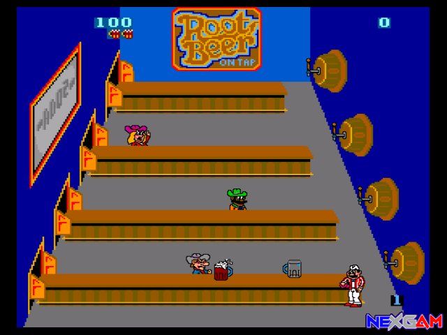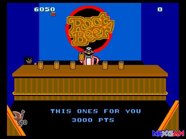 Hin und wieder erscheint also ein Kunde am Ende einer Theke und macht auf sich aufmerksam. Euer Job ist es nun, möglichst zügig an die entsprechende Theke zu gehen (D-Pad), das Root Beer abzufüllen (A-Button) und es in Richtung Kunde zu schieben (erneut A-Button). Und weiter geht es zur nächsten Theke, bis ihr das Level erfolgreich beendet habt. Nach dem Genuss des Inhalts lassen die Kunden ihre Gläser zurück kommen, die ihr aufsammeln solltet. Rutschen die leeren Gläser über den Thekenrand, kostet das ein Leben. Besonders nette Kundschaft hinterlässt Trinkgeld, welches ihr ebenfalls schnell einsammeln solltet, damit es eurem Punktekonto gutgeschrieben wird. Nachdem ihr ein Level erfolgreich beendet habt, gibt es ein kleines Ratespielchen, bei dem weitere Punkte gewonnen werden können.