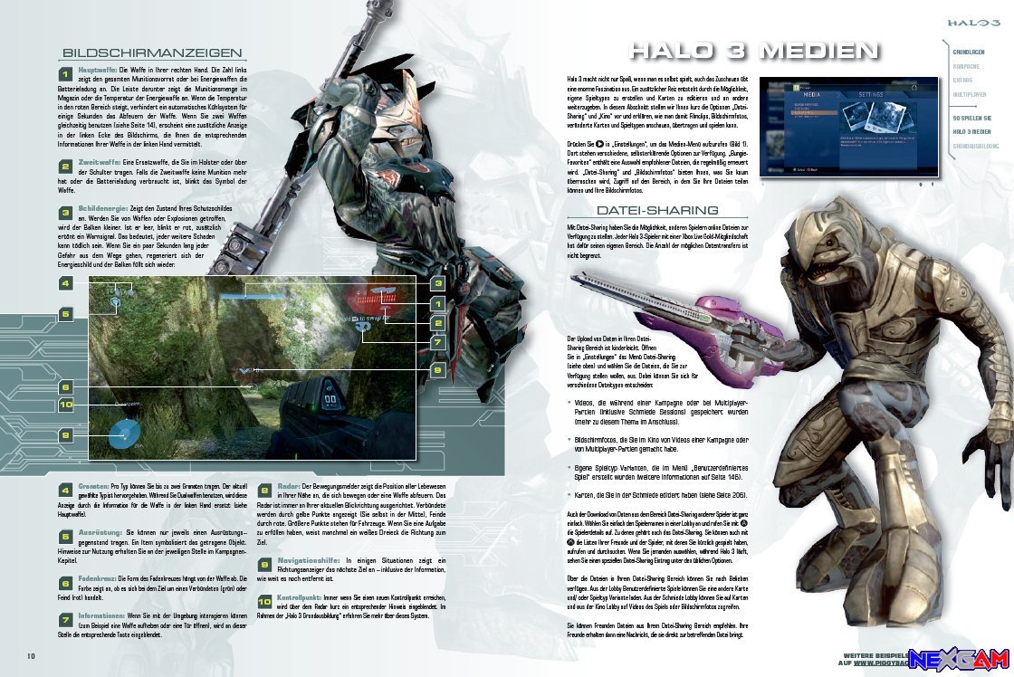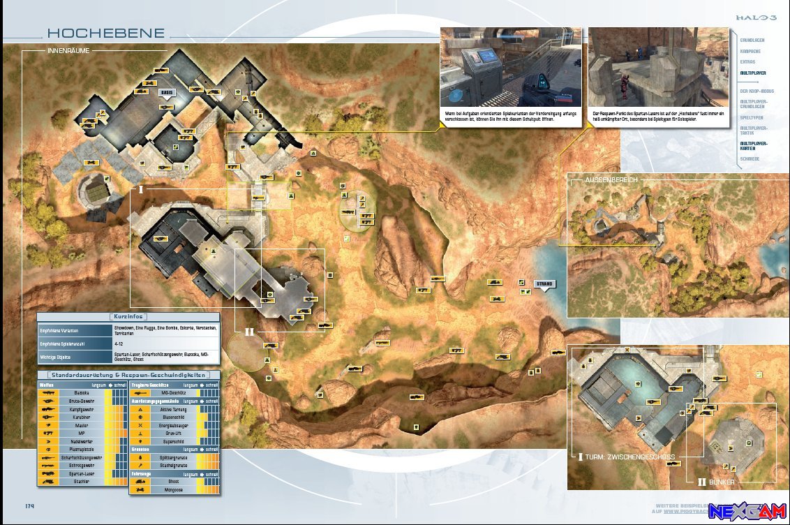 Auf insgesamt 94 Seiten wird die Singleplayer Kampagne von Halo 3 bis ins kleinste Detail auseinandergenommen – spoiler-frei, versteht sich. Zu jeder Mission gibt es eine große Übersichtskarte aus der Vogelperspektive, zwei Lösungswege (normal, detailliert für ‚Legendär’), Tipps am Rande und vieles mehr. Besonders hilfreich sind die Detailkarten, auf denen u.a. die Fundorte sämtlicher Gegenstände eingetragen sind. Auf diesen Detailkarten findet ihr außerdem Symbole, die euch die ungefähre Anzahl zu erwartender Gegner verrät. Auf den letzten beiden Seiten jeder Mission findet der Leser die Einsatzbesprechung, in der die neuen Gegner, Items und Fahrzeuge beschrieben werden, die in der jeweiligen Mission vorkamen.